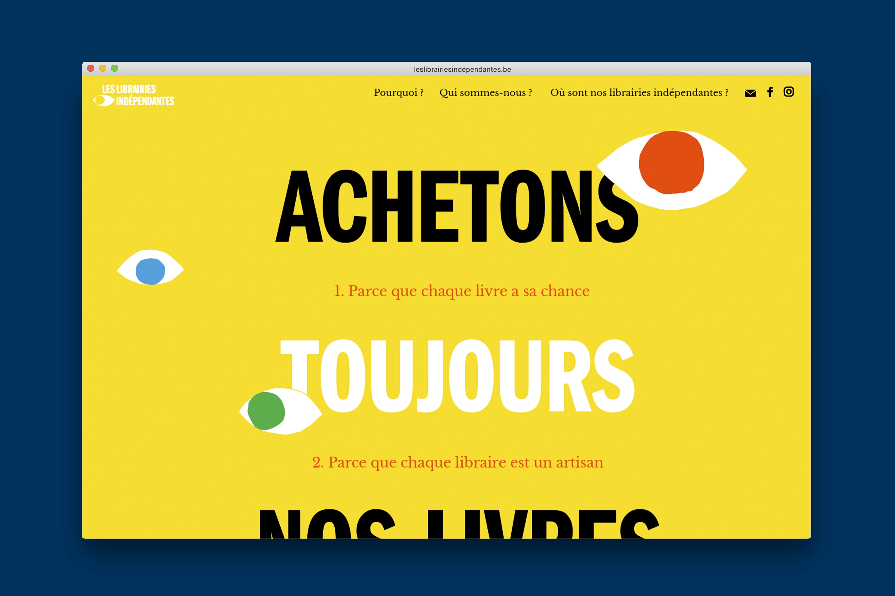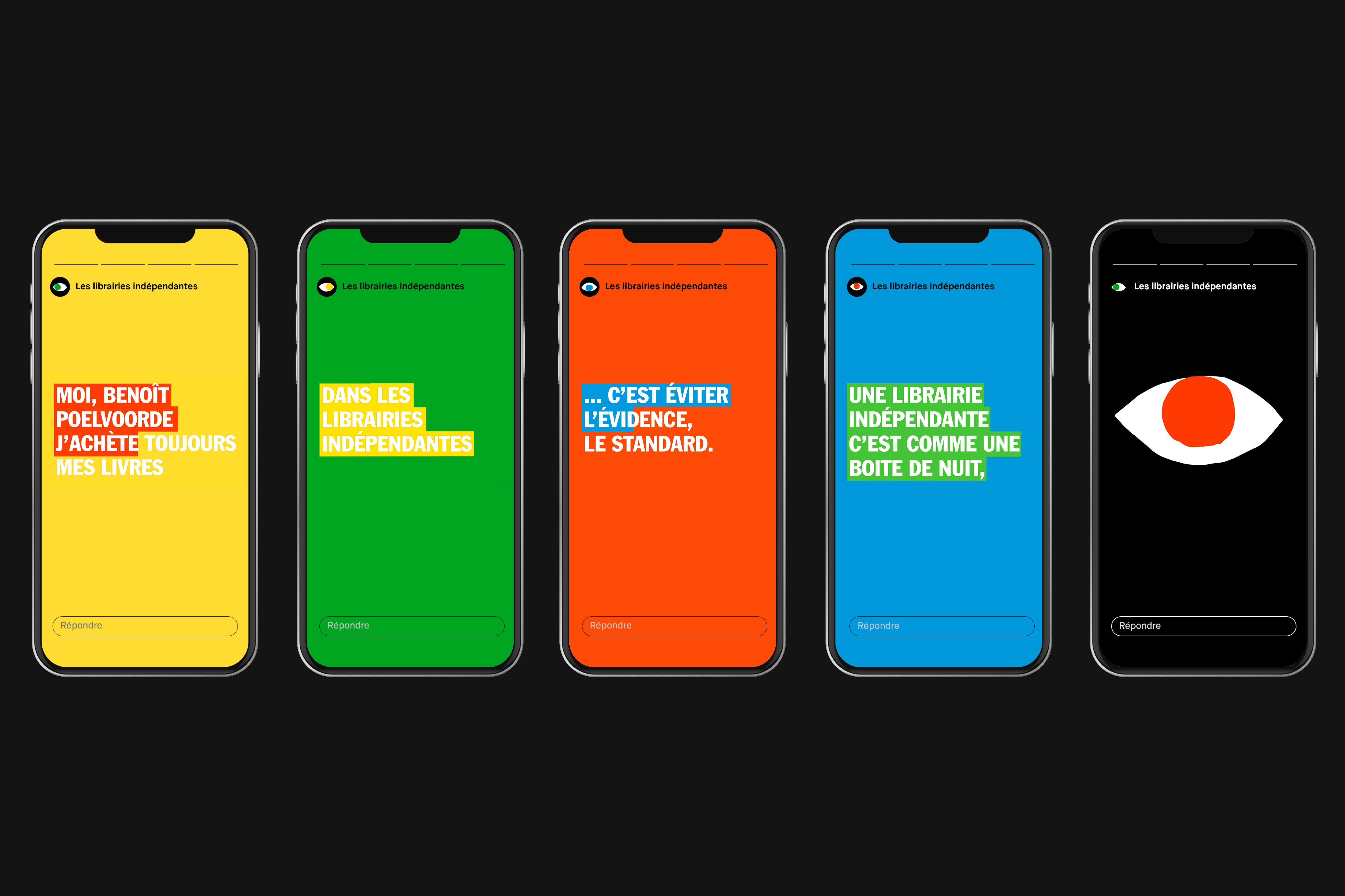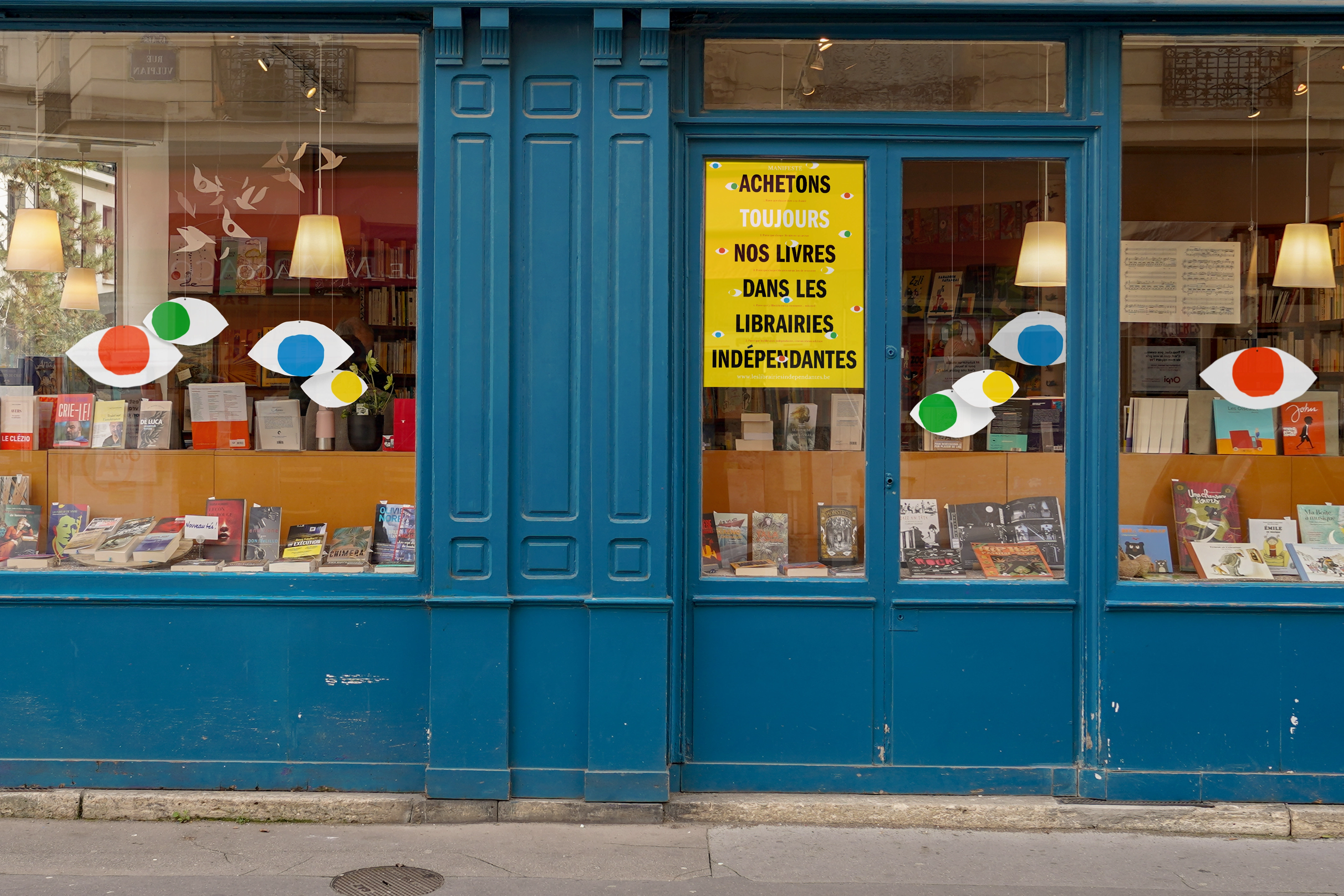 Over the past decade, independent bookstores and small businesses have been threatened by the presence of chains, online mega-platforms. The French-speaking booksellers’ union of Belgium (SFLB) therefore decided to launch an awareness campaign that would get readers back into independent shops and rekindle their love for printed matter. We co-crafted a movement whose mascot was a pair of eyes and whose visual identity was vibrant, direct, upfront, and playful.